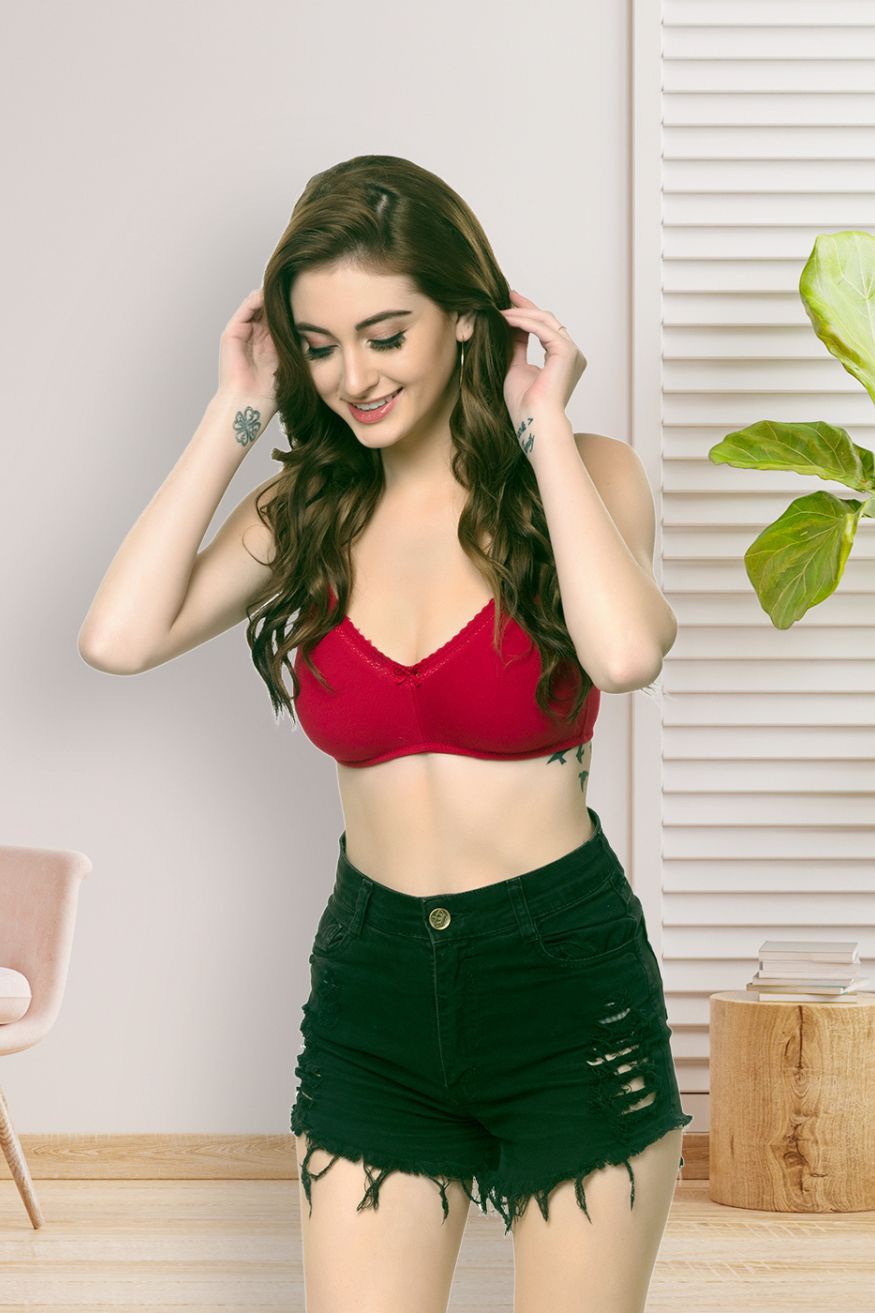 •This inner sense maroon non-padded bra has attractive laced design, double layered, seamless, wire free cups. It is apt to wear under any clothing.