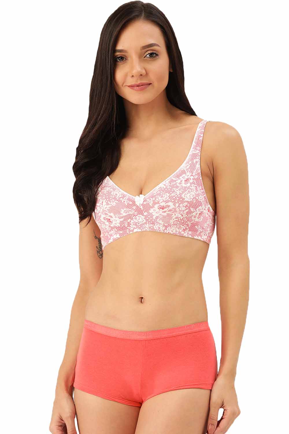 •This Inner Sense pink lace print bra is non-padded, non-wired & has double layered cups. It has concentric stitches on the side cup for better lift & shaping. It is apt to wear under t-shirts.