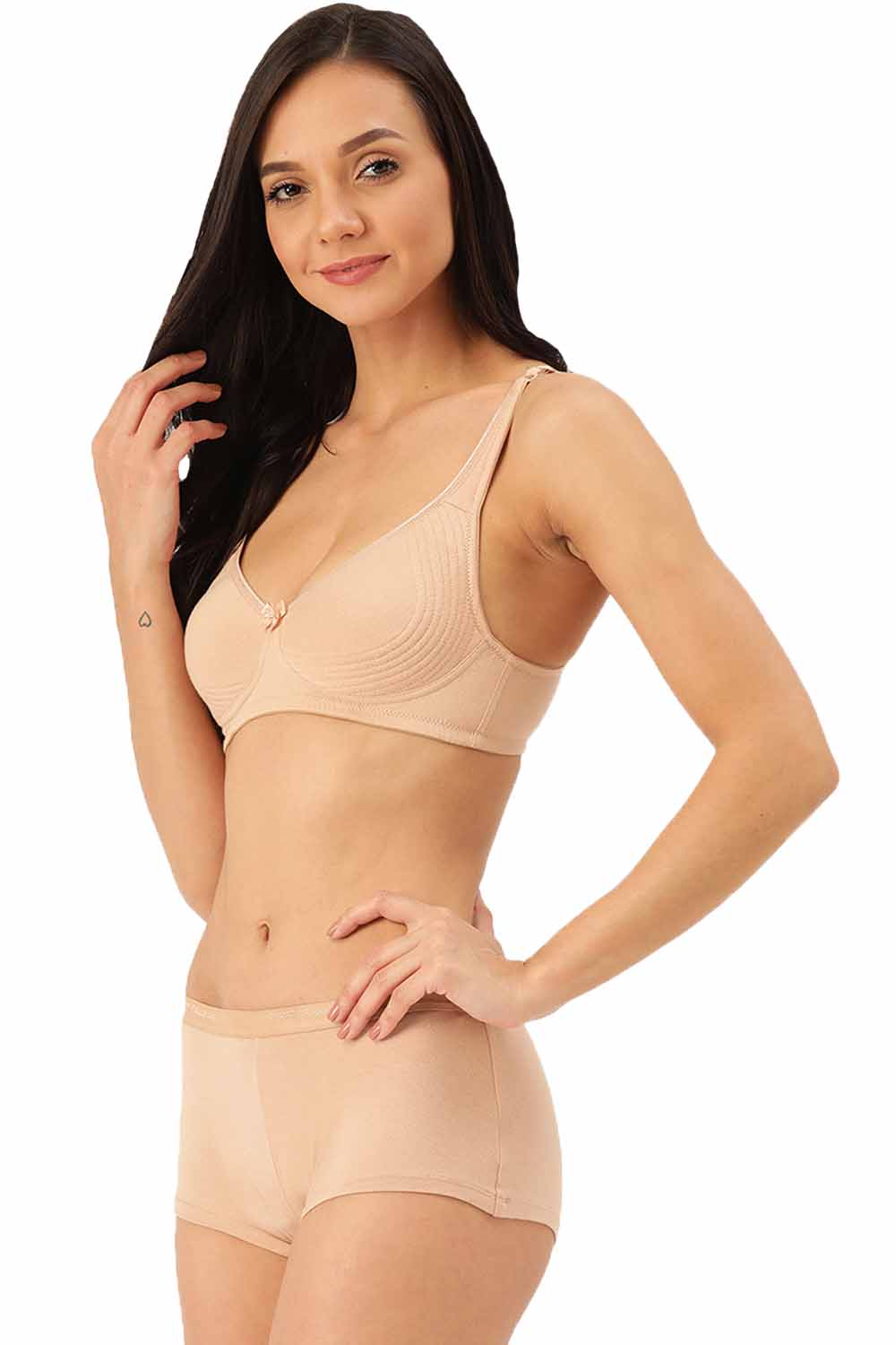 •This Inner Sense beige bra is non-padded, non-wired & has double layered cups. It has concentric stitches on the side cup for better lift & shaping. It is apt to wear under t-shirts.