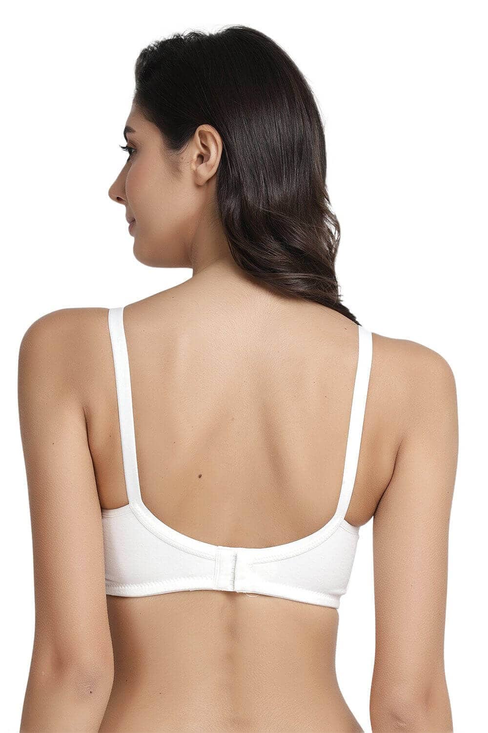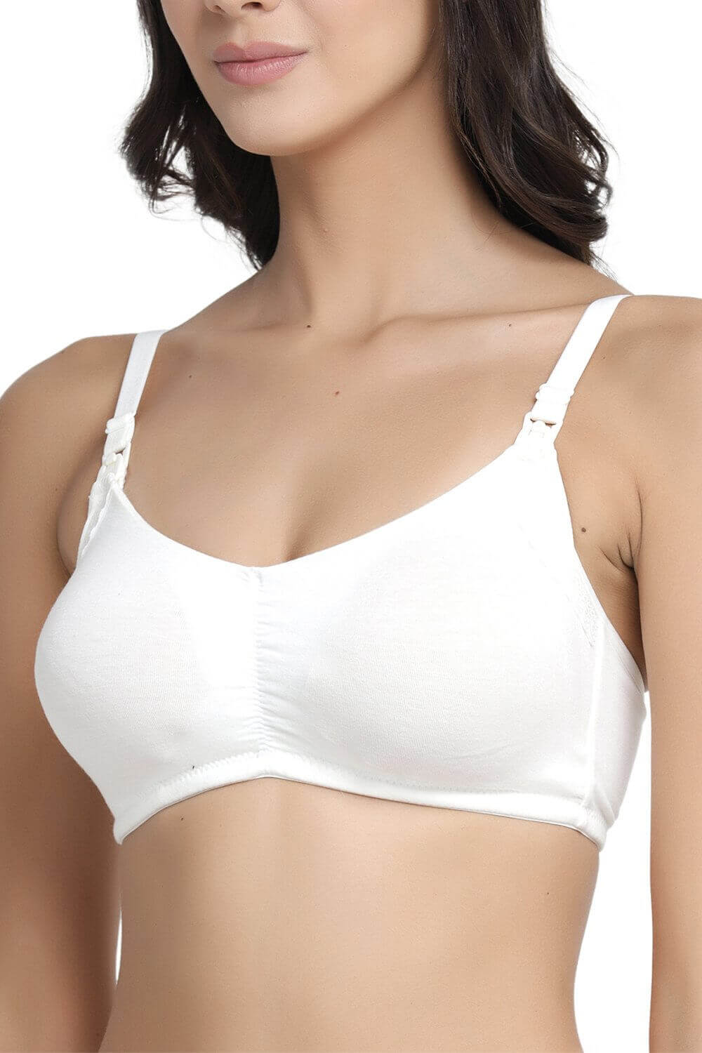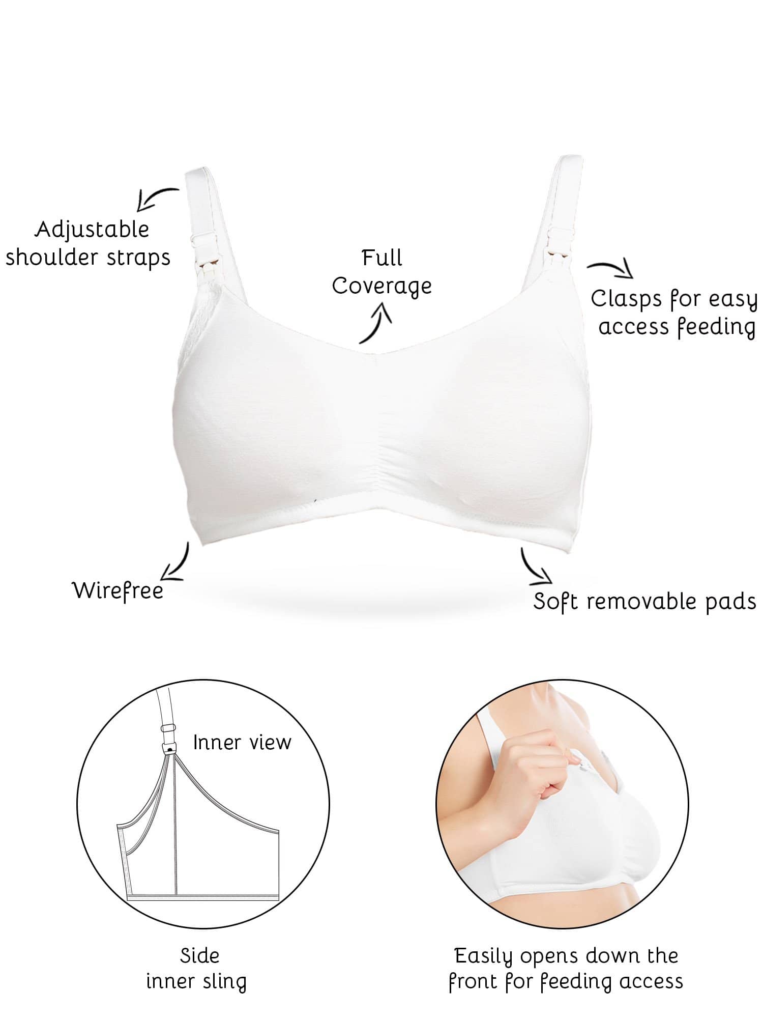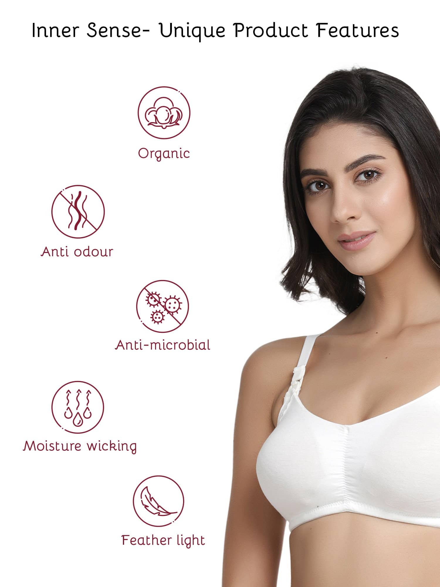 •This Inner Sense white nursing bra has seamless, with removable pads, wire free cups. It is apt to wear under any clothing. Breastfeeding access via clasps that can be pulled down.