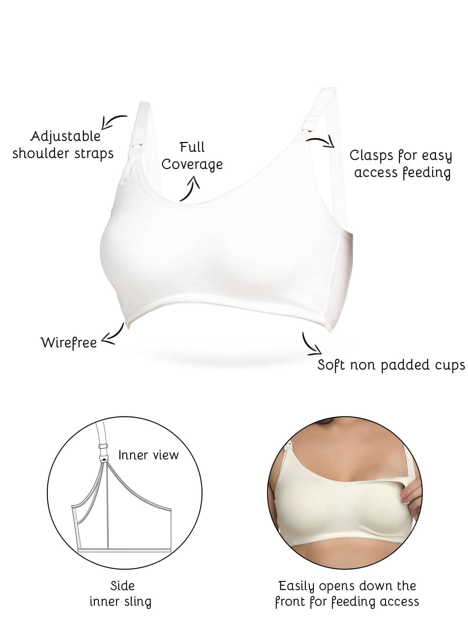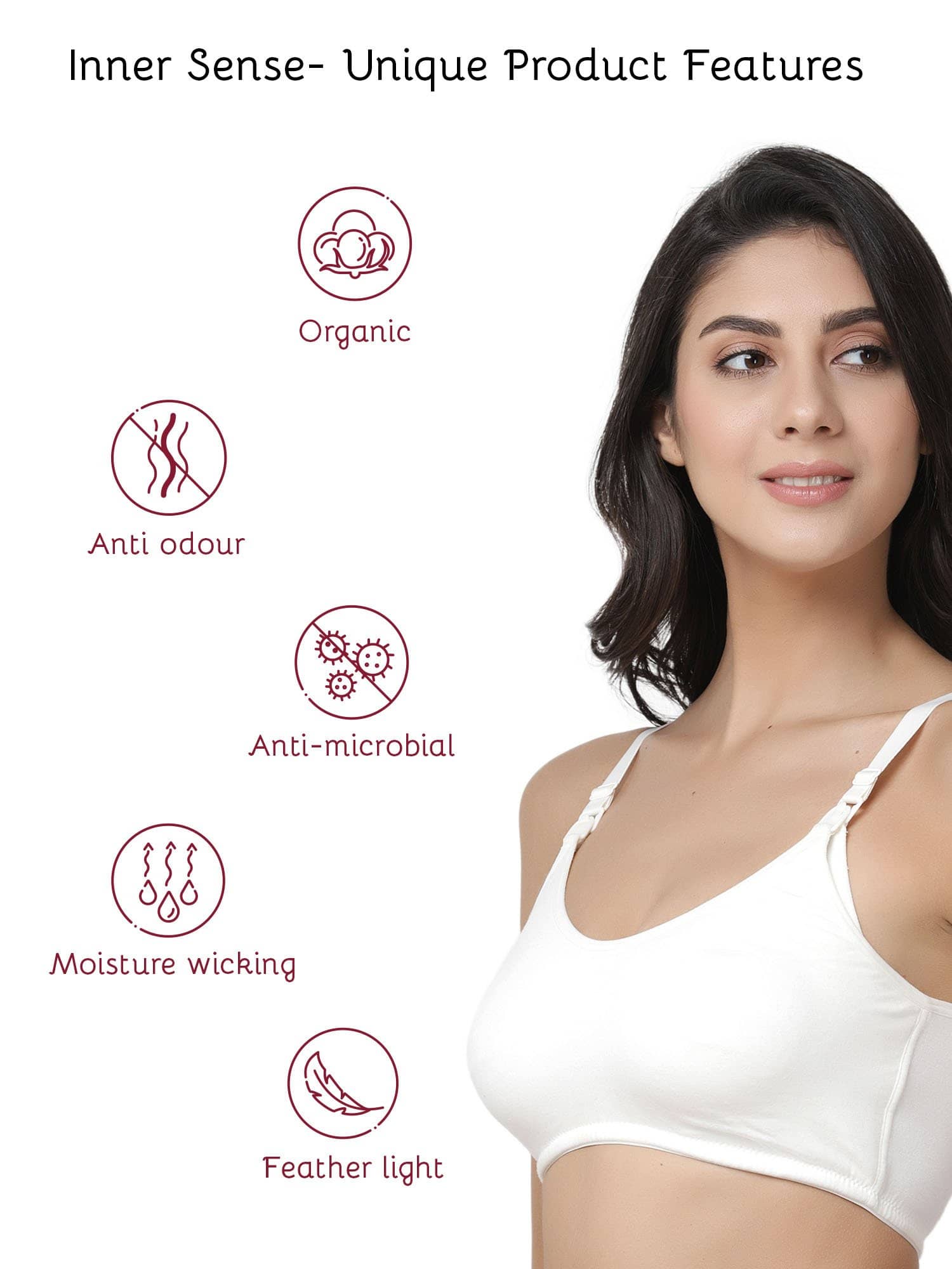 •This Inner Sense white nursing bra has seamless, nonpadded, wire free cups. It is apt to wear under any clothing. Breastfeeding access via clasps that can be pulled down.