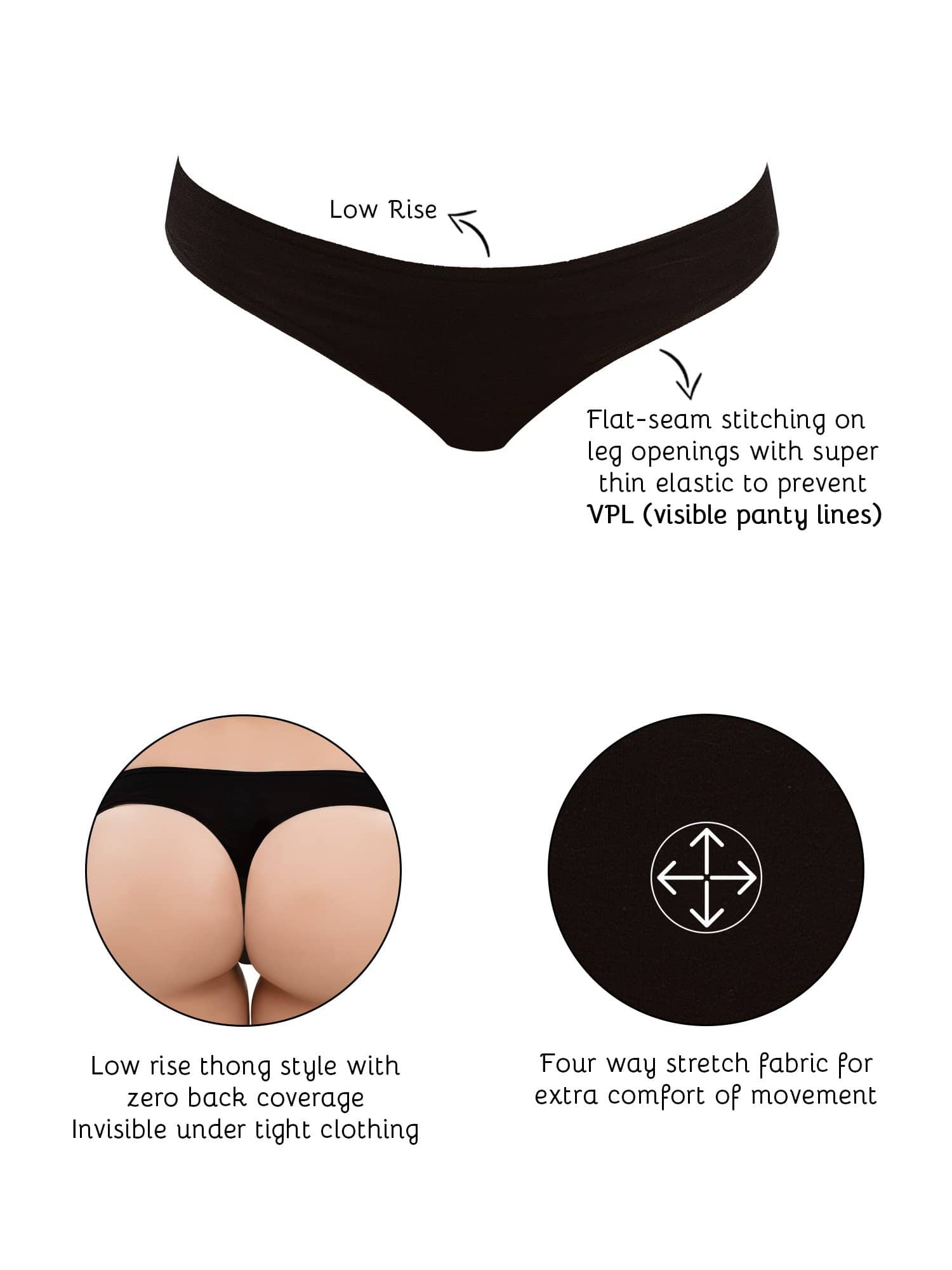 •Flat-seam stitching with super-thin elastic to prevent VPL (visible panty lines).