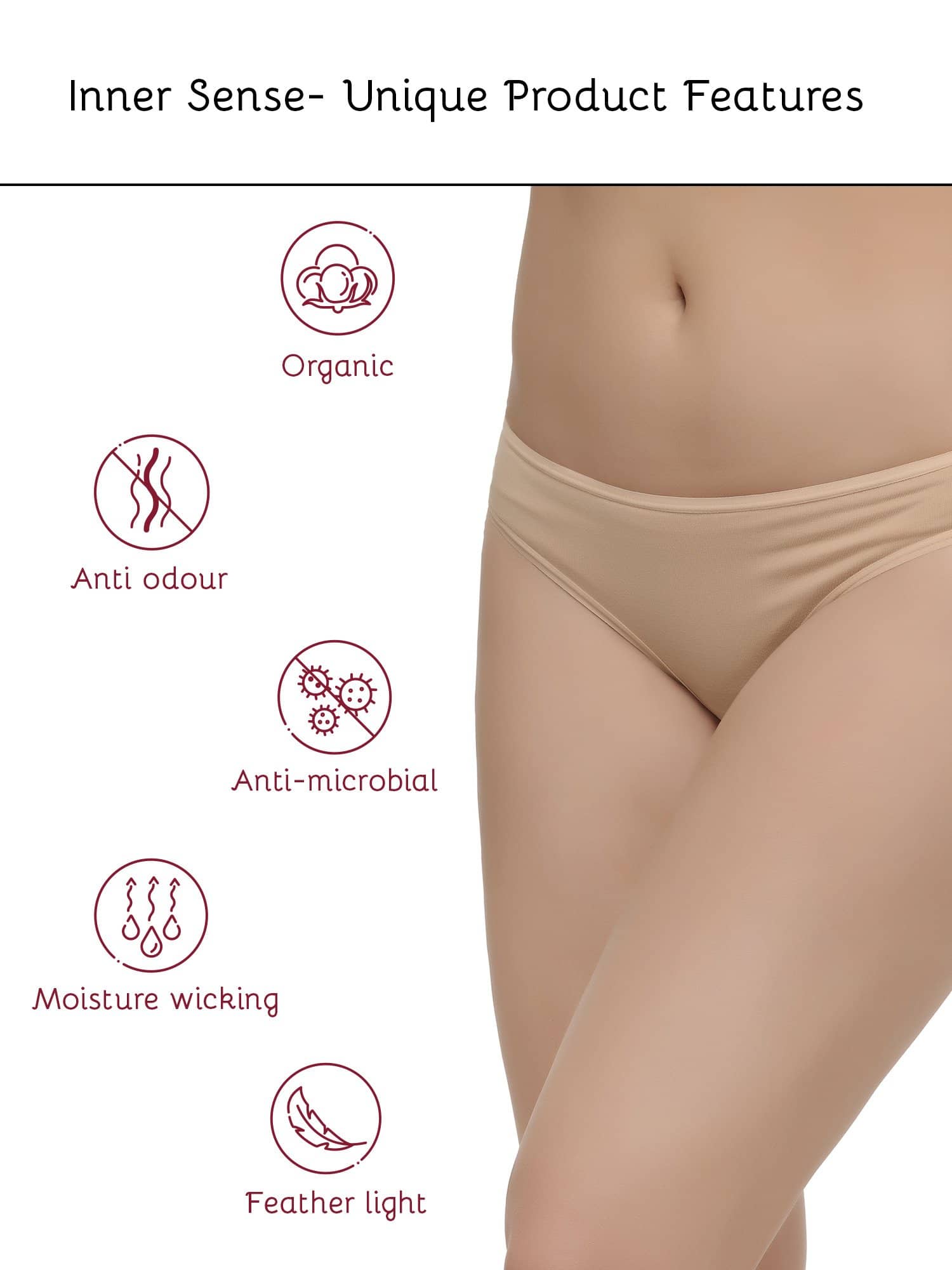•Inner Sense beige low rise thong style with zero back coverage. Invisible under tight clothing.