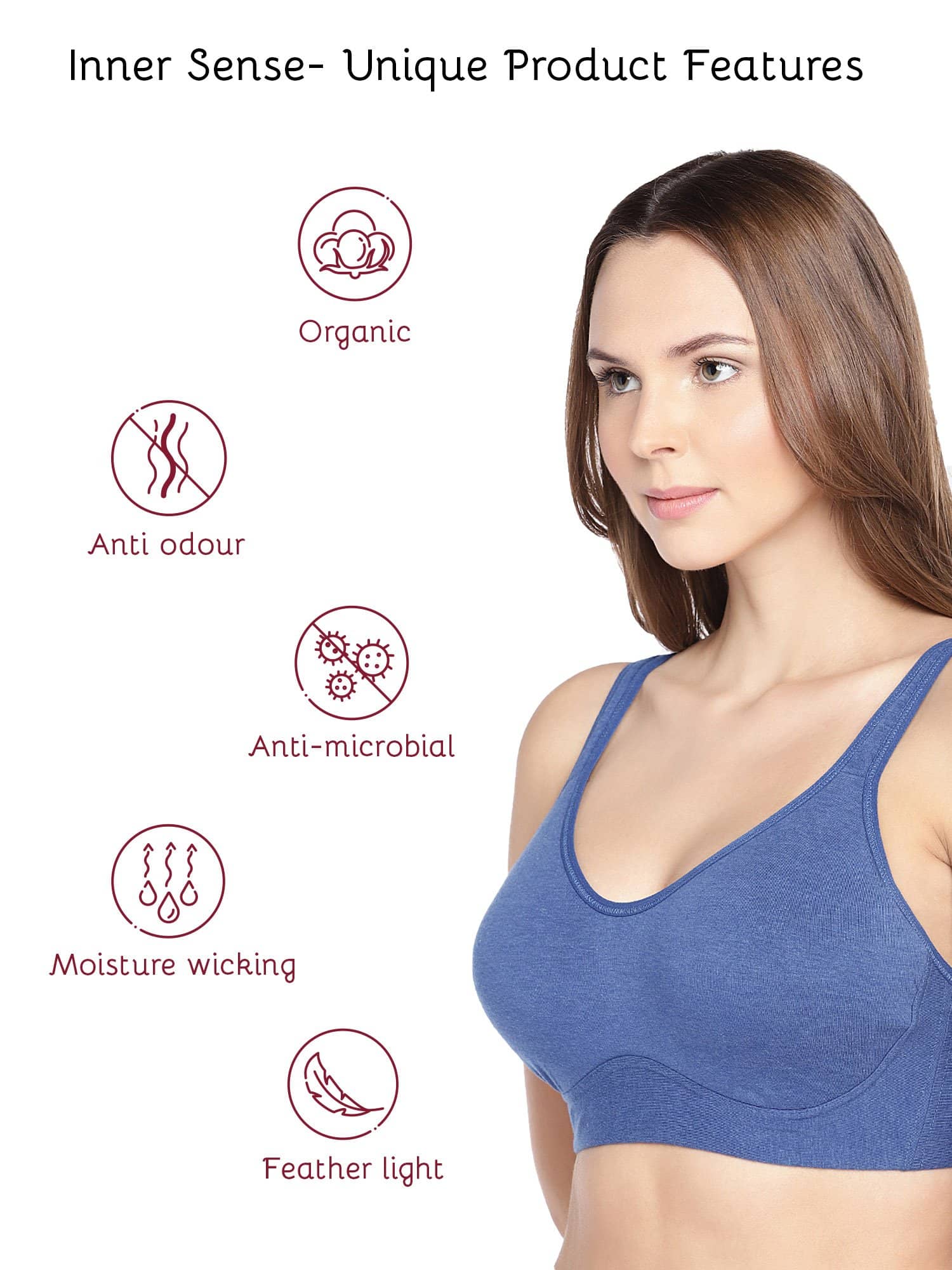 •This Inner Sense blue double layered bra has seamless, foamed moon patch at bottom of cups which helps in better hold, wire free cups. It is full-coverage & looks smooth & goes invisible under all kinds of clothing.