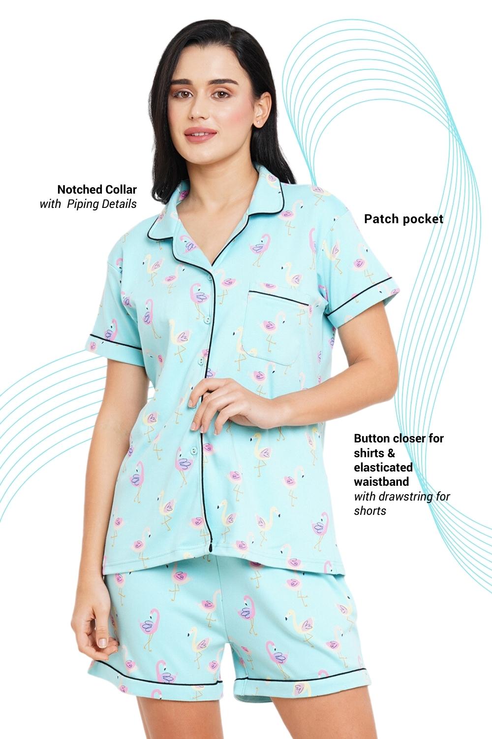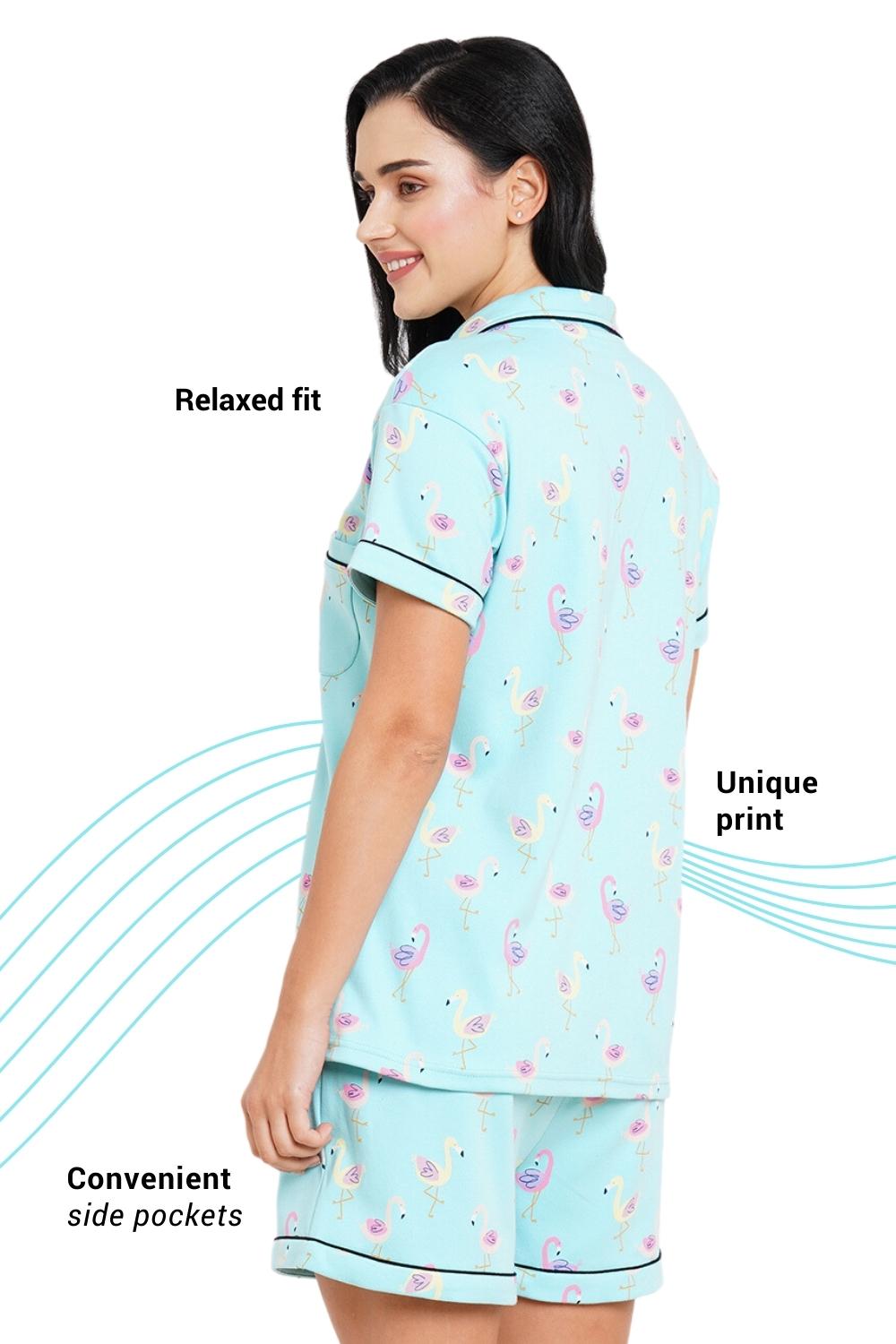 - Overall, our flamingo print shorts set for women is a stylish and environmentally-friendly option for those who want to make a statement while still being conscious of their impact on the planet. The soft, breathable fabric and playful print make it a versatile addition to your nightwear collection. Shop our collection of night suits for women and experience the ultimate in comfort and sustainability.