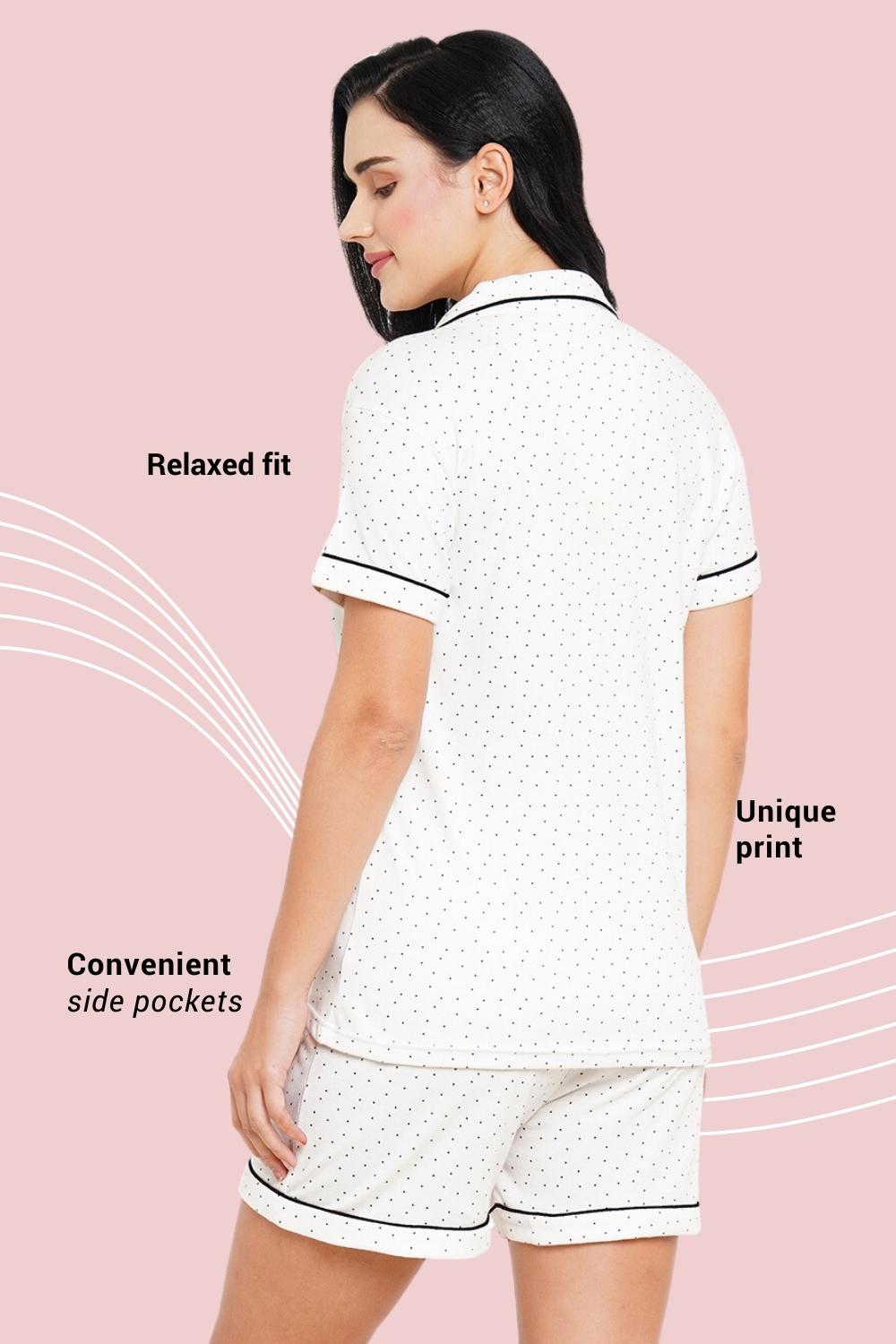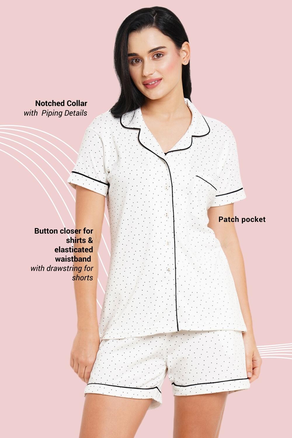 - Overall, our Polka print shorts set for women is a stylish and environmentally-friendly option for those who want to make a statement while still being conscious of their impact on the planet. The soft, breathable fabric and playful print make it a versatile addition to your nightwear collection. Shop our collection of night suits for women and experience the ultimate in comfort and sustainability.